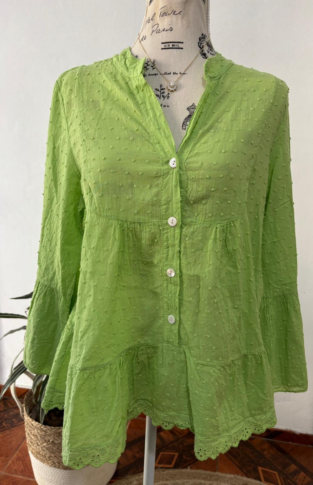 Bata Camisa plumeli CategorÃasMusculosas Vestidos Semijoyas POLLERA Pollera Jeans Blusas Básicas Shorts Shorts en lino Shorts en jeans Bermudas Bermudas sociales Bermudas en lino CHALECO BATAS FIESTA Camisas JEANS BUZOS PANTALONES SACOS Y CHAQUETAS General Bata Camisa plumeli$2.380 Ref:33192 No:616/0190 Color Elige una opciónVerde manzana Talle Elige una opciónMLimpiar Bata Camisa plumeli cantidad Comprar ahora SKU: 616/0190 CategorÃas: BATAS, Camisas, General Información adicional Información adicional Color Verde manzana Talle M Productos relacionados Pantalon Stabros en pana $2.390 Seleccionar opciones Camisa en algodon $1.390 Añadir al carrito Buzo en modal con detalles $890 Seleccionar opciones Camisa anuket con broderie $1.390 Seleccionar opciones