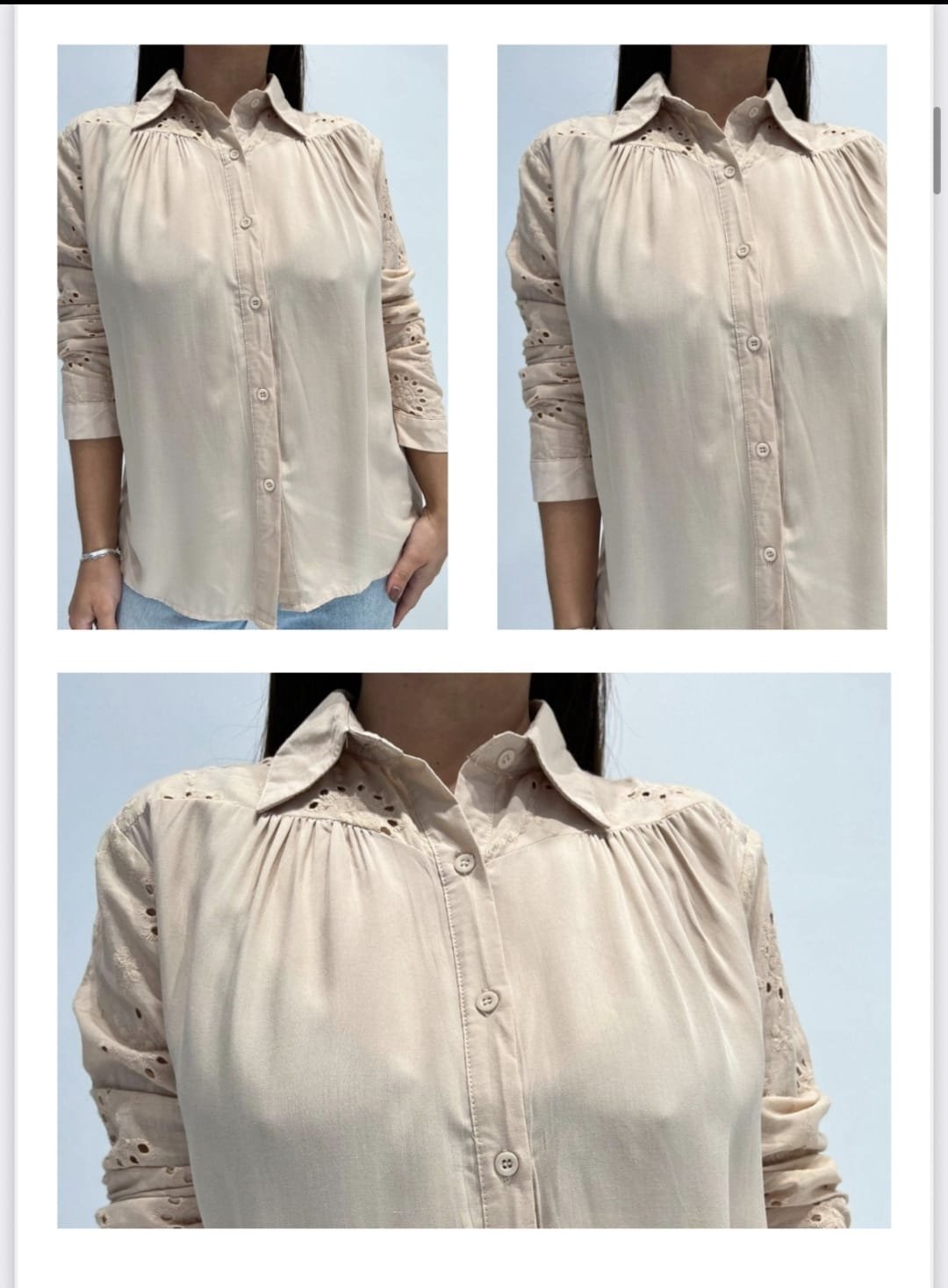 Camisa Con detalle Broderie Mangas CategorÃasMusculosas Vestidos Semijoyas POLLERA Pollera Jeans Blusas Básicas Shorts Shorts en lino Shorts en jeans Bermudas Bermudas sociales Bermudas en lino CHALECO BATAS FIESTA Camisas JEANS BUZOS PANTALONES SACOS Y CHAQUETAS General Camisa Con detalle Broderie Mangas$1.390 Ref: Y02 No:488/069 Color Elige una opciónBeige Talle Elige una opciónMLLimpiar Camisa Con detalle Broderie Mangas cantidad Comprar ahora SKU: 488/069 CategorÃas: Camisas, General Información adicional Información adicional Color Beige Talle M, L Productos relacionados Jean Modelador MOM $1.790 Seleccionar opciones Buzo en modal con detalles $890 Seleccionar opciones Jean semi-oxford Ginebra TRIBAL $2.190 Seleccionar opciones Pantalón Wide leg en pana $1.190 Seleccionar opciones